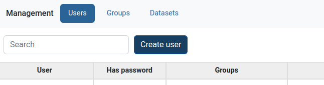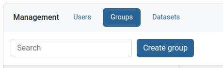 In the Datasets tab on the Management menu, admins can observe information about which users have access to a dataset or which groups does a dataset belong to. The easiest way to add a dataset to multiple groups is through the Datasets table view.