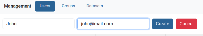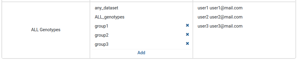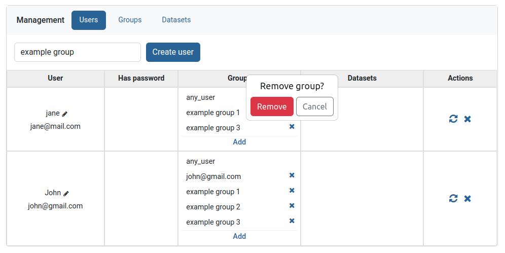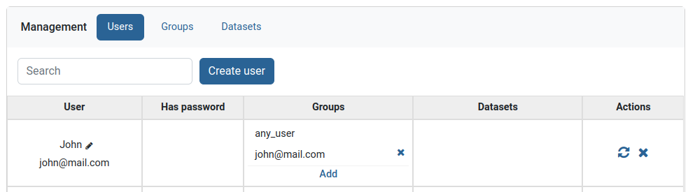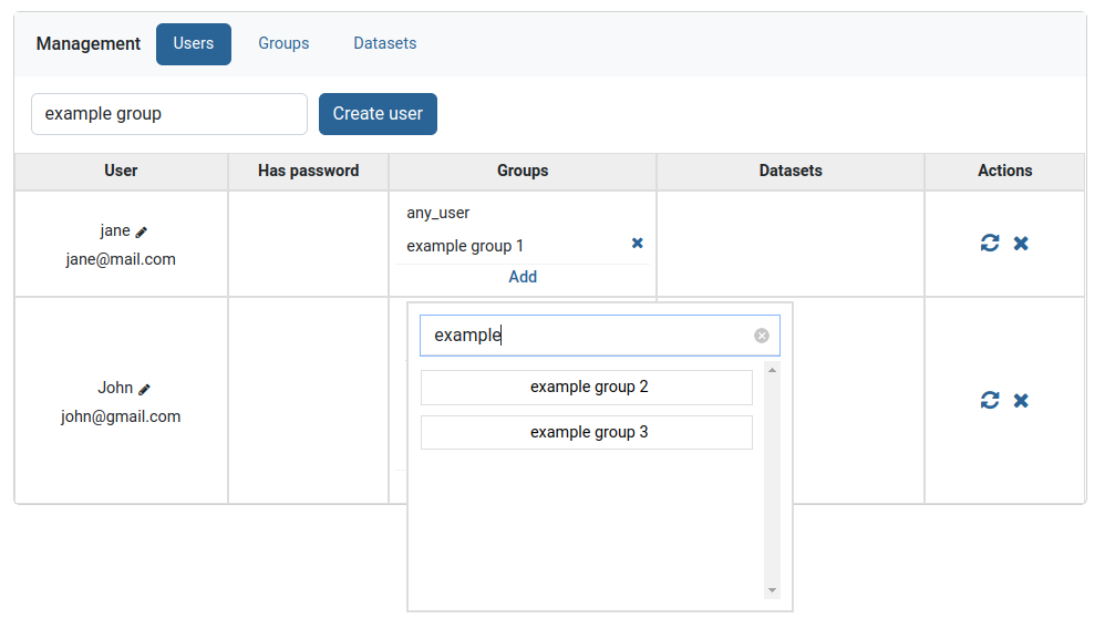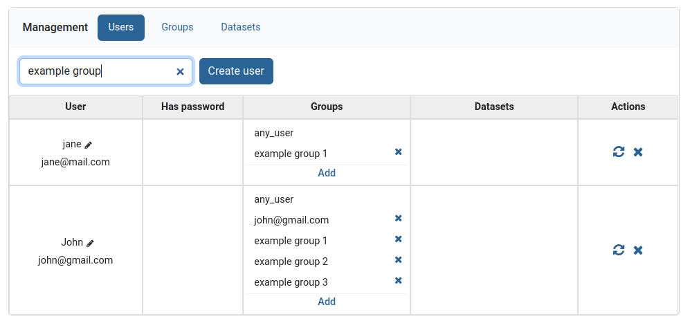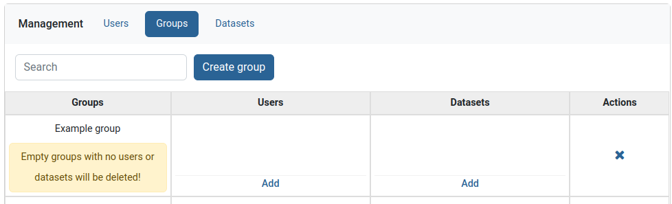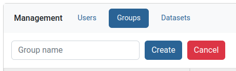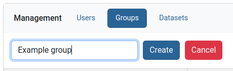 Groups are entities that associate users with datasets. If a user wishes to access a certain dataset, he has to belong to a group containing that dataset. Users and datasets can be in multiple groups simultaneously. The easiest way to add multiple users and datasets to a group is through the groups table view.