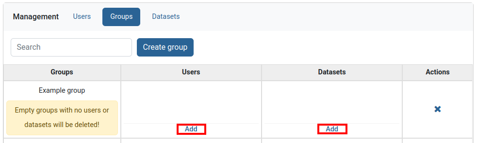 Find the group you want to edit then add users and datasets through the Add buttons in users and datasets columns.