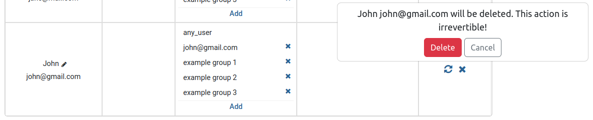 Clicking on the utmost right X button in the Actions column, deletes the user shown on the current row.