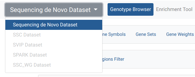 This filter allows the user to limit his query to a specific set of genes. We provide collections of published gene sets as well as sets based on de novo variants in our datasets. A download link is available for the selected gene set.