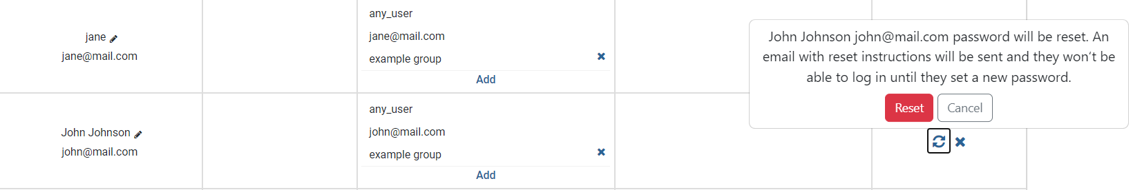 Clicking on the left icon in the Actions column, resets the password of the user shown on the current row. This button will send the user in question an email with a corresponding link, obligating them to choose a new password for their account.
