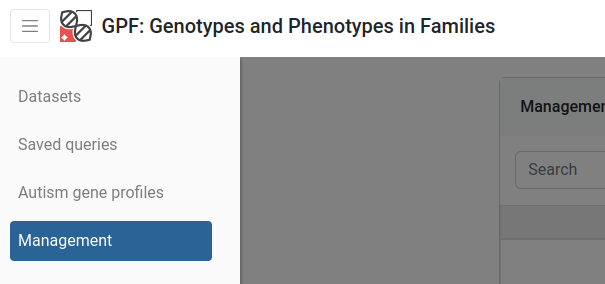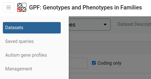 Upon accessing the GPF instance, the user is greeted by the Home page, which includes a brief description of the instance(fig. 1.1), a shortcut to the Gene Profiles tool(fig. 1.2), and a list of all configured datasets (fig. 1.3). Each dataset represents a group of families along with the available phenotypic and/or genotypic data for their members. Next to each dataset the user can find a set of icons(fig. 1.4) providing useful details such as the presence of de novo or transmitted variants, the availability of phenotype data, and other relevant information. Note that access to some of the datasets may be restricted; users may log into their account or contact an administrator if access has not yet been granted. The top bar(fig. 1.5) can be used to navigate between different pages of GPF.
